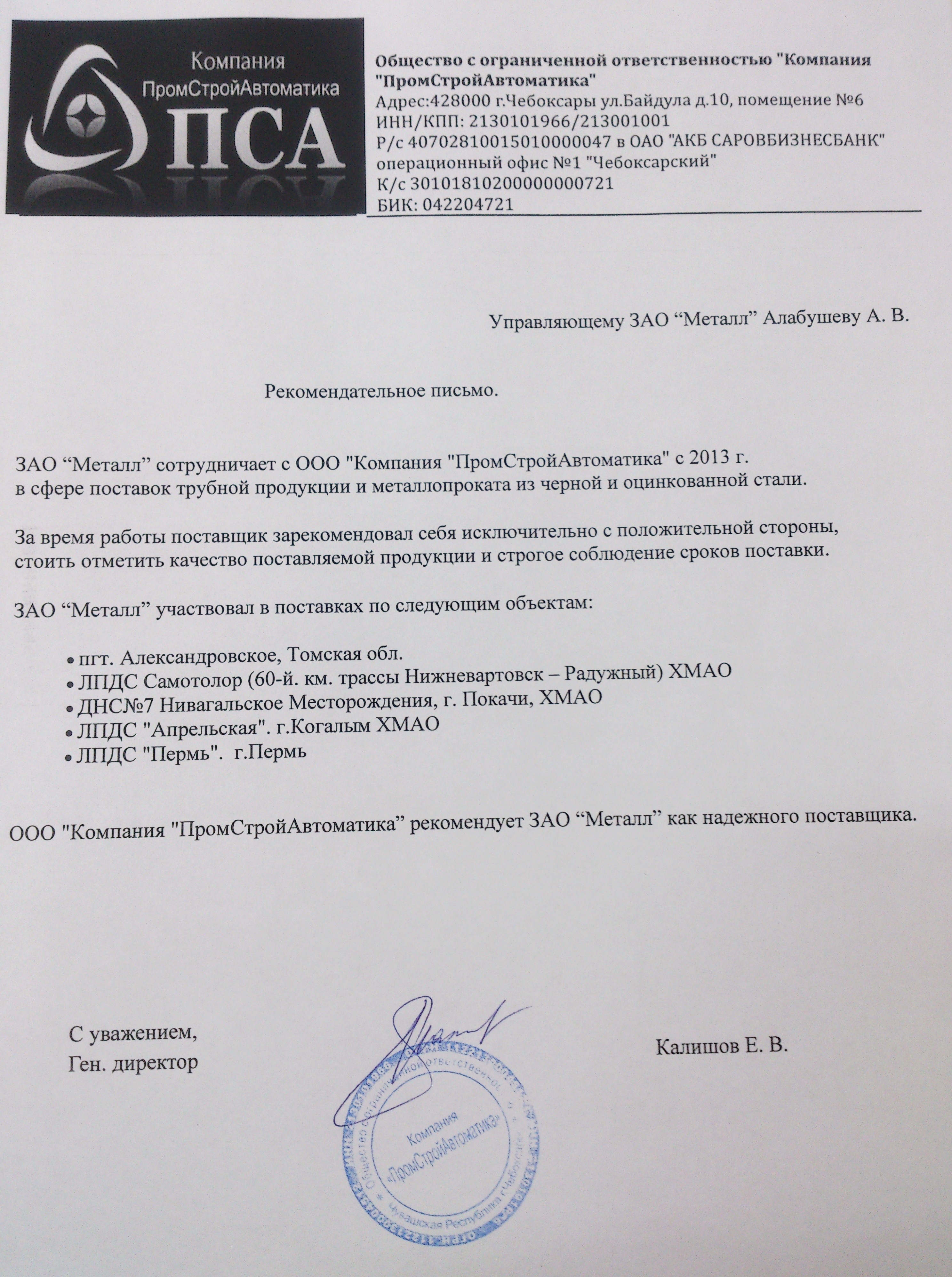 ООО "Компания "ПромСтройАвтоматика" рекомендует ЗАО "Металл" как надежного поставщика.
