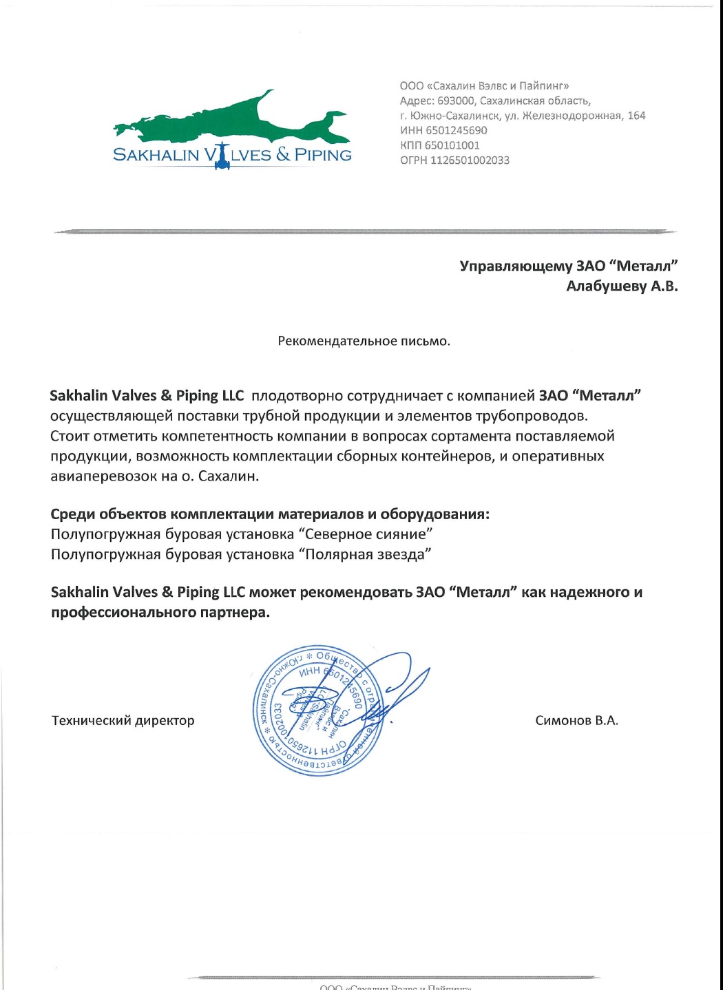 Sakhalin Valves & Piping LLC может рекомендовать ЗАО "Металл", как надежного и профессионального партнера.